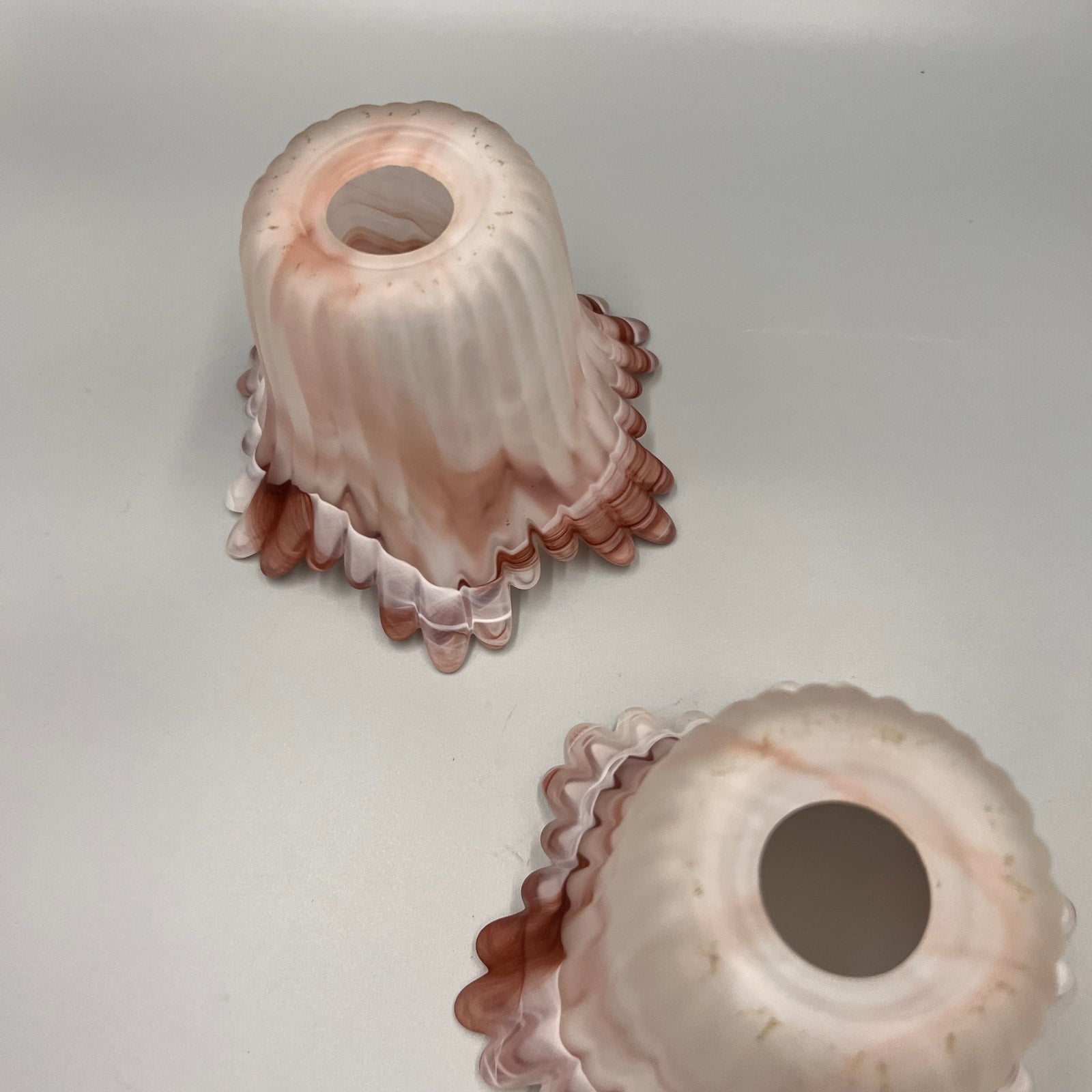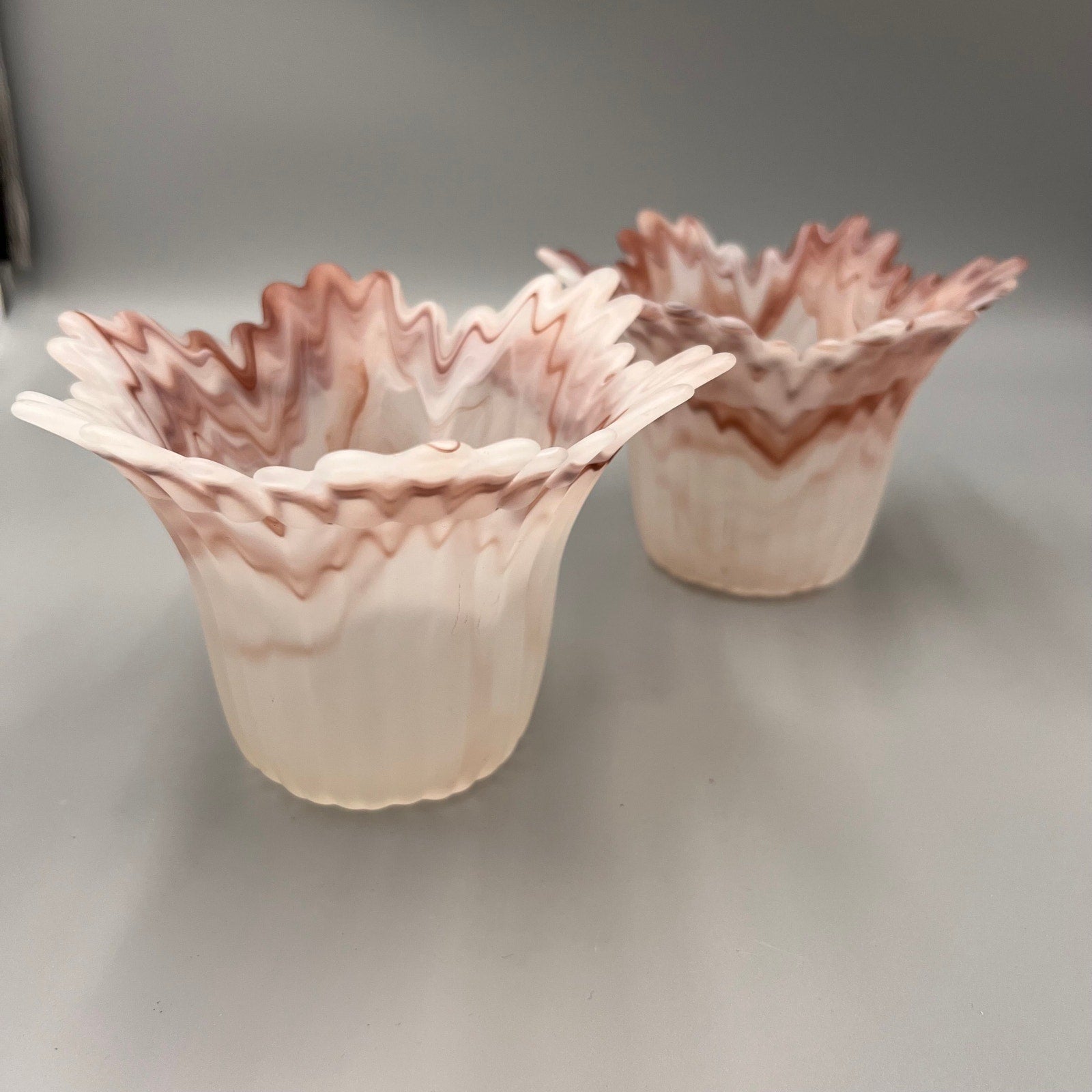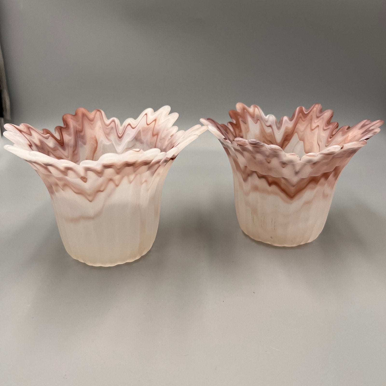 Pair of Marbled Pink Art Glass Lamp Shades – Ruffled Edge Swirl Satin Glass – Vintage Style Light Covers, 1-5/8" Fitter