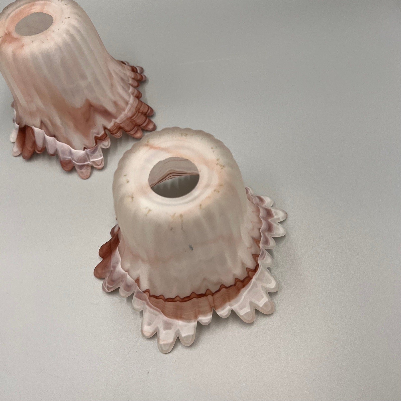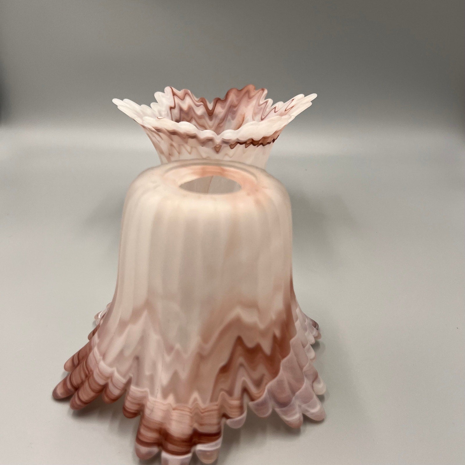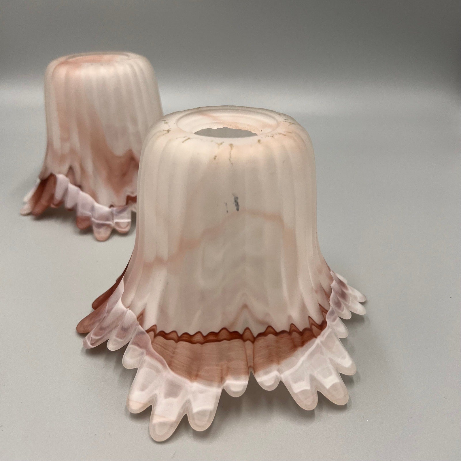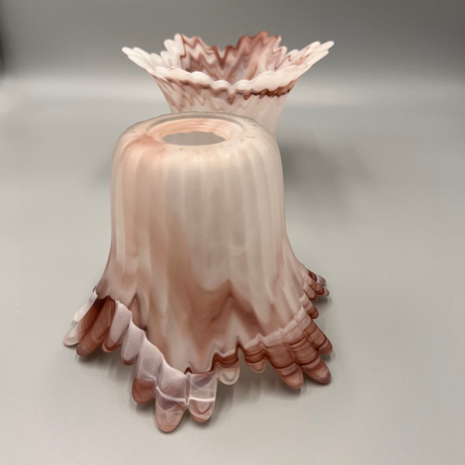 Add a touch of vintage charm to your home with this beautiful pair of marbled art glass lamp shades. Featuring soft swirls of pink, white, and taupe, these shades showcase a satin finish and dramatic ruffled edges that create a stunning light-diffusing effect.