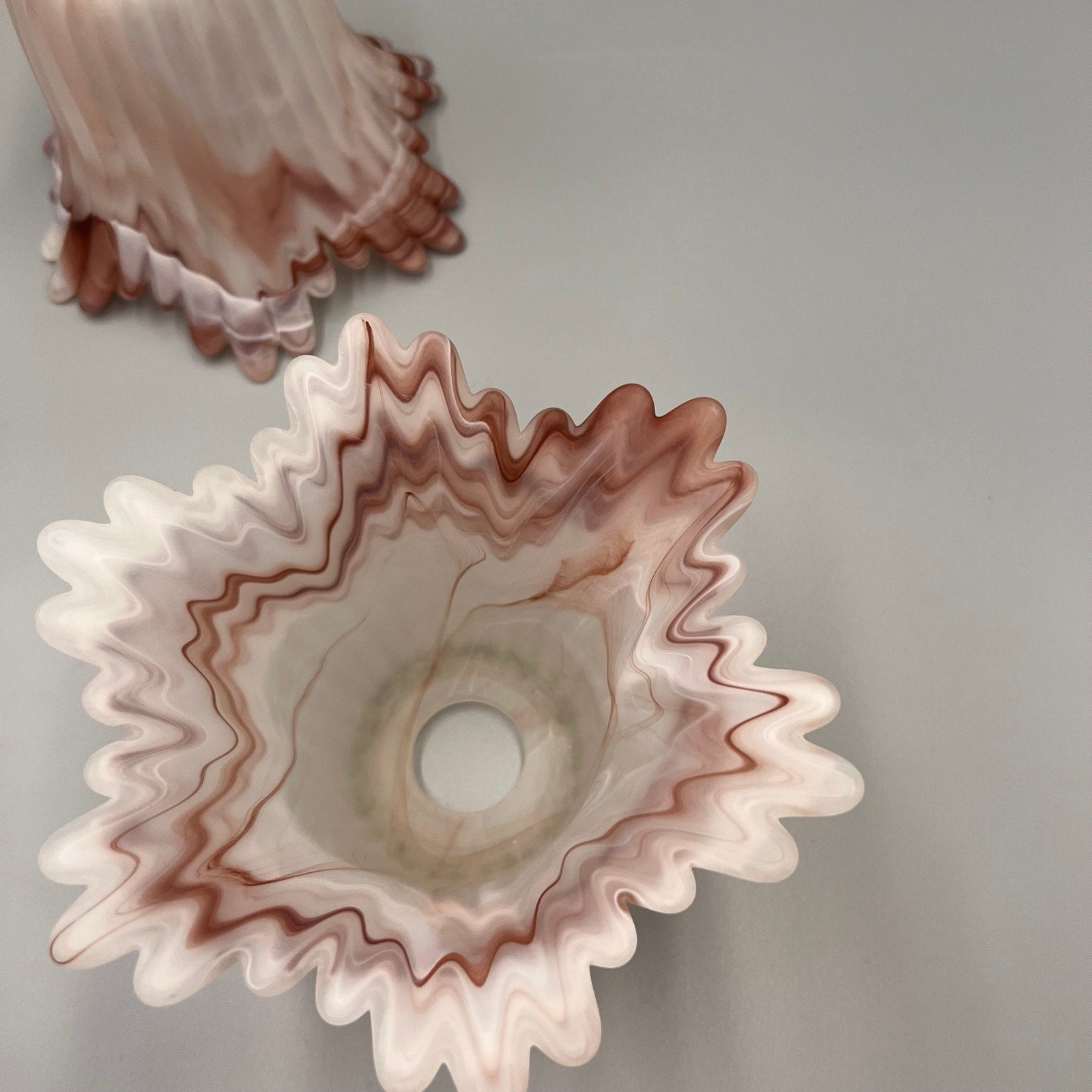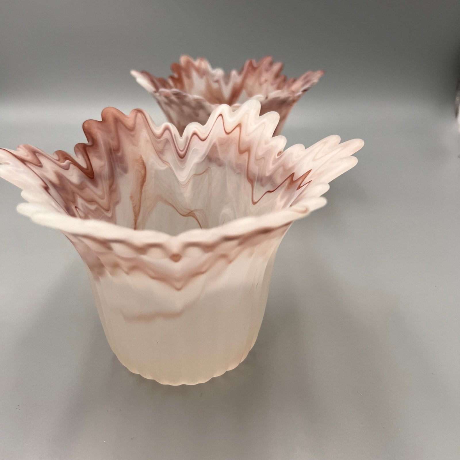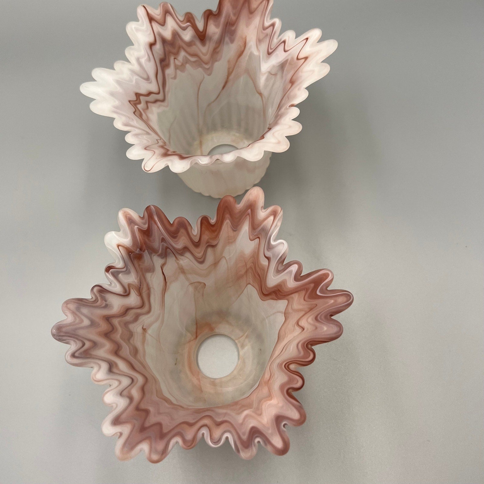 Add a touch of vintage charm to your home with this beautiful pair of marbled art glass lamp shades. Featuring soft swirls of pink, white, and taupe, these shades showcase a satin finish and dramatic ruffled edges that create a stunning light-diffusing effect.