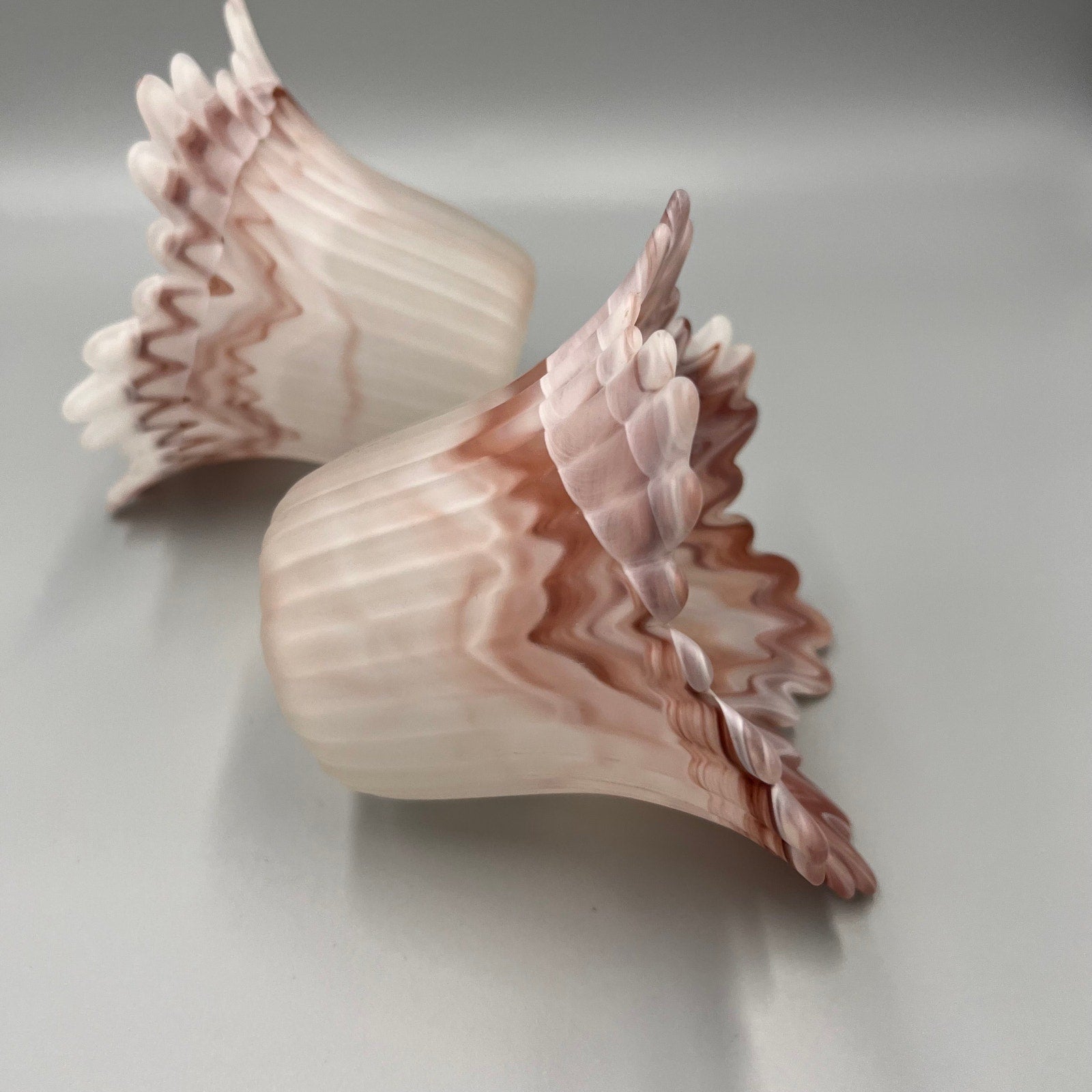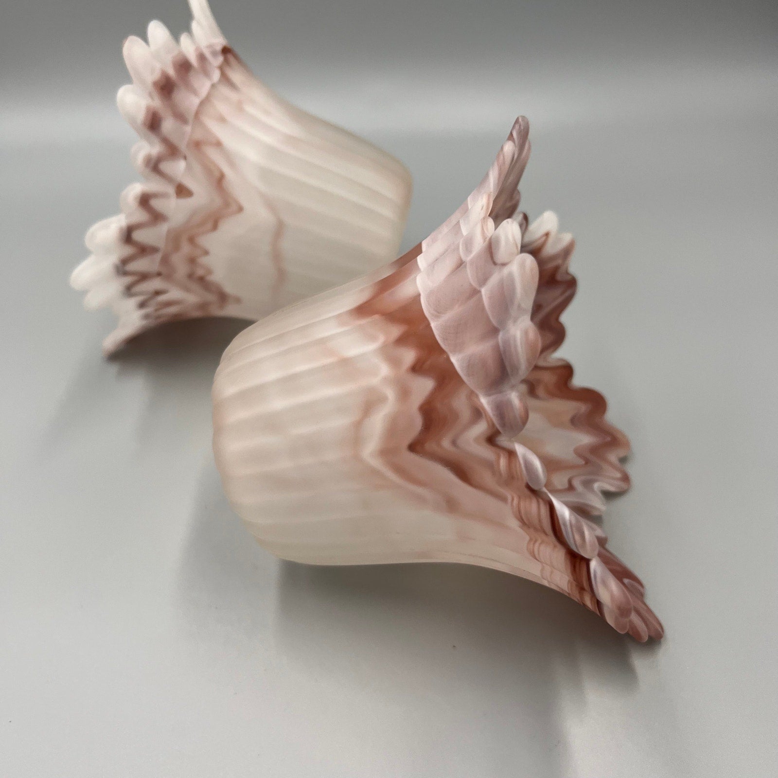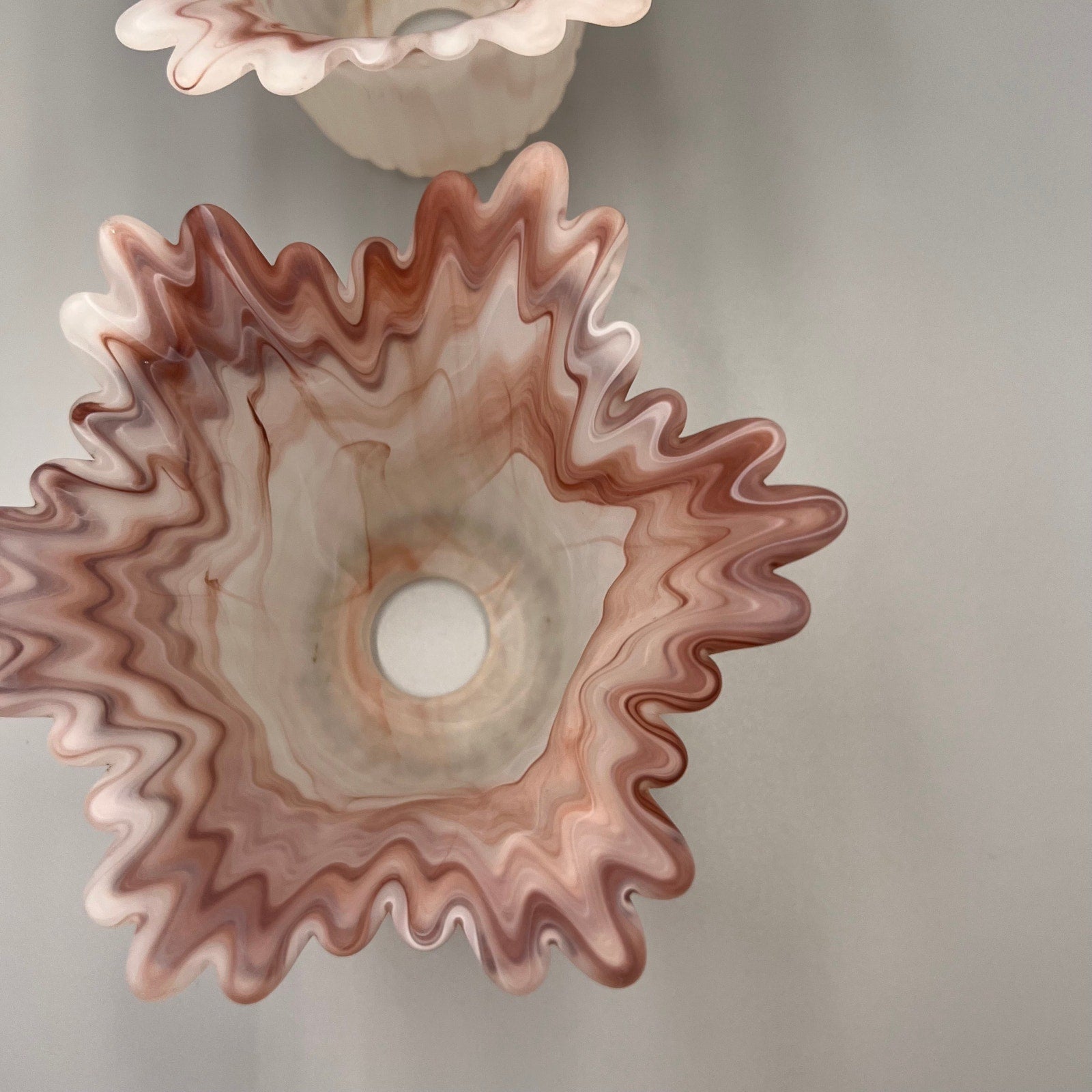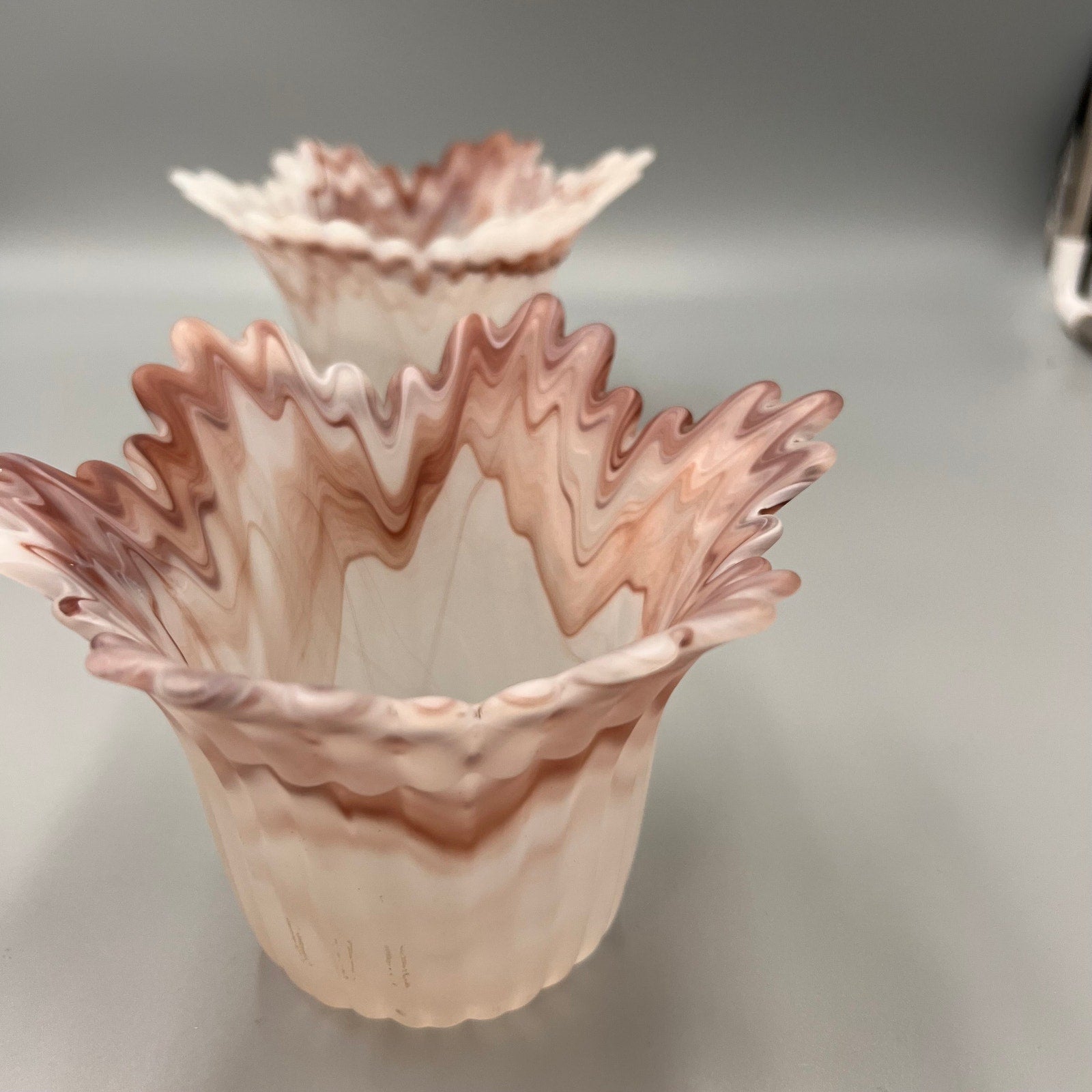 Add a touch of vintage charm to your home with this beautiful pair of marbled art glass lamp shades. Featuring soft swirls of pink, white, and taupe, these shades showcase a satin finish and dramatic ruffled edges that create a stunning light-diffusing effect.